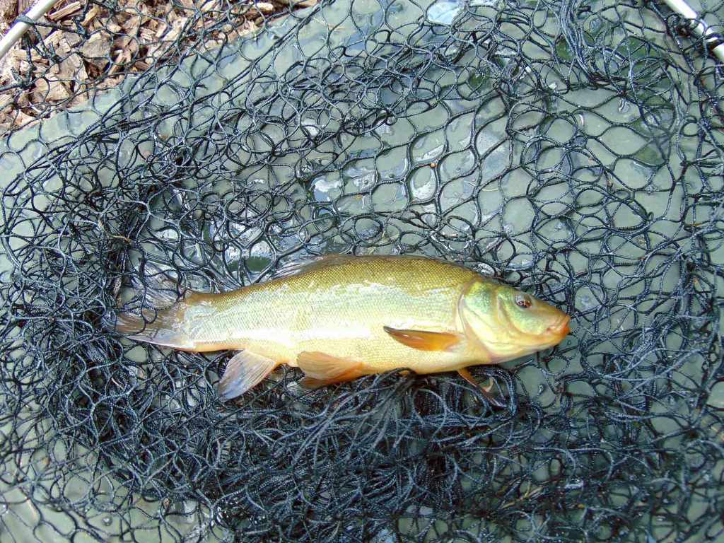 I fished from around 14:00 until 20:00. I spoke to a friend on the phone who told me to wait for the seventh chime of the church bells and I would land a 2lb Crucian. This did not happen. The church bells did ring seven and the rod did indeed double over, it was not a Crucian. A tremendous battle ensued and I was convinced I had hooked Moby (the one and only Carp in the pool). I could not get the fish to the surface to see what it was. I then remembered that I was now also fishing with 2lb line so was super cautious. I eventually won the day and heaved up a tremendous Tench which was slightly longer than my 18” inch landing net. I reached for my disgorger to see that the line had snapped the second I had landed the fish. This was truly a miracle.