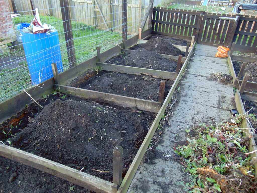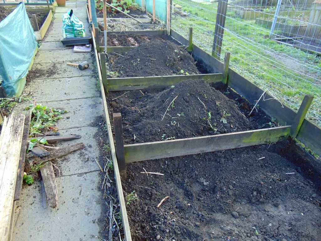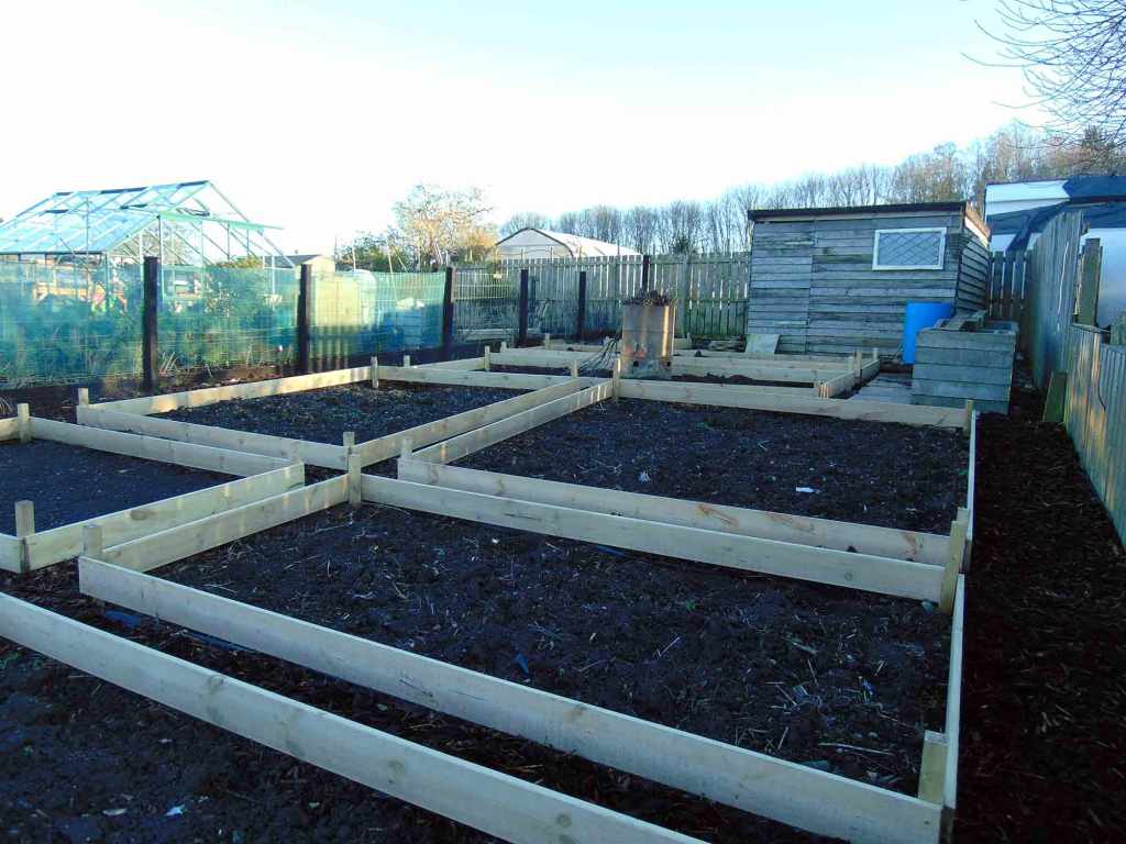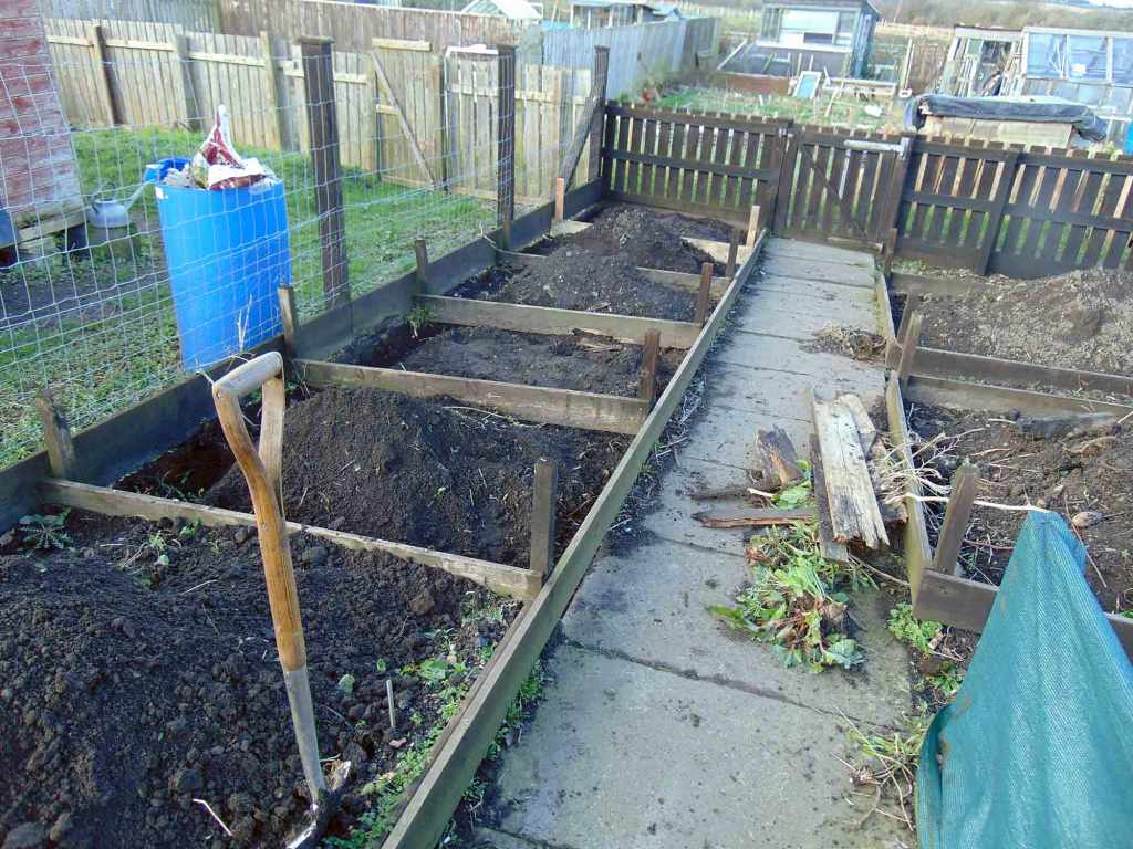 I think I installed these raised beds at the allotment maybe 8 years ago. The timber used was treated, and I have kept on top of the woodwork with creosote every other year. Time is slowly taking it’s toll around the place, and a number of sections have given way to rot. I had to bite the bullet and start shifting quite a bit of soil out of the raised beds in order to access the wood to replace these rotted sections..