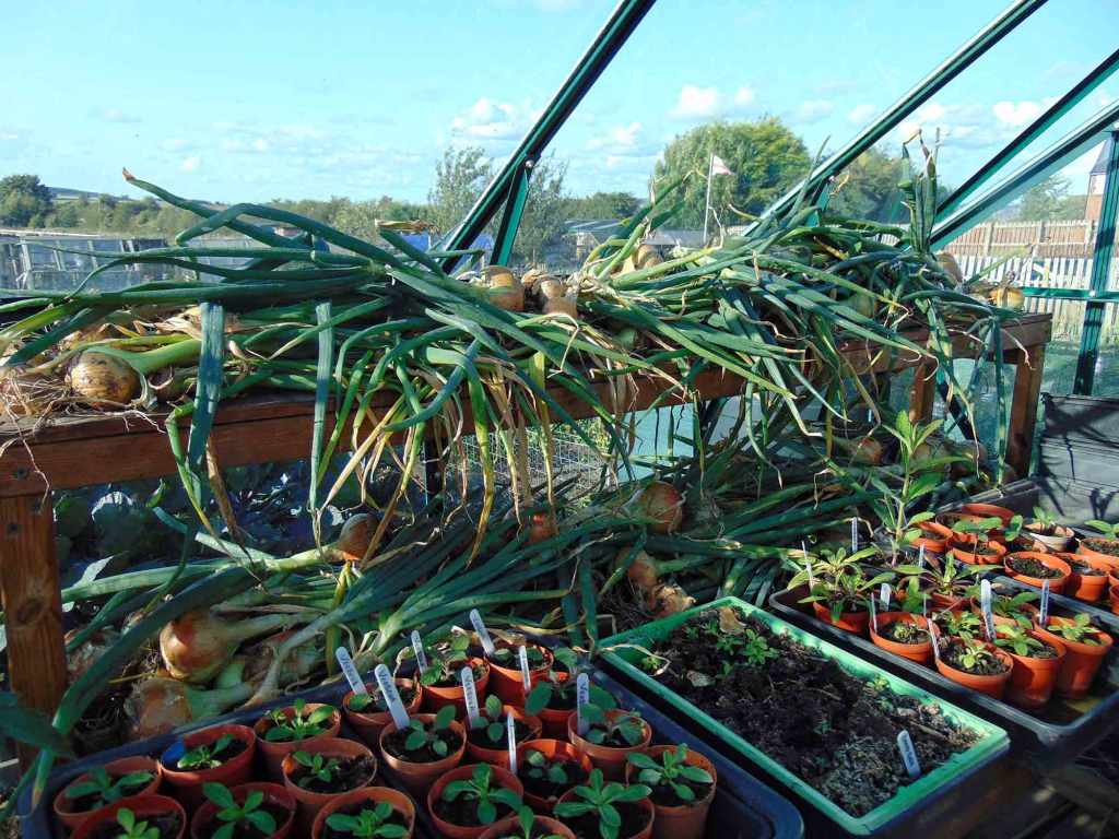Lifted the first batch of potatoes today which were “Nadene“. Also lifted perhaps the last batch of Rhubarb for this year. All the onions were lifted and stored on the benches in the greenhouse to dry-off.