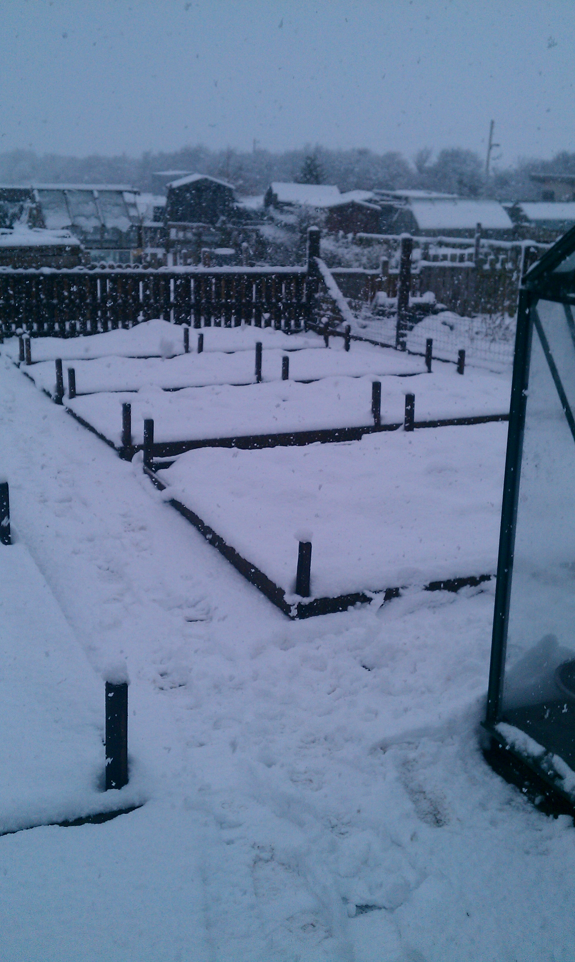 Picture of snow fall covering the raised beds at an allotment