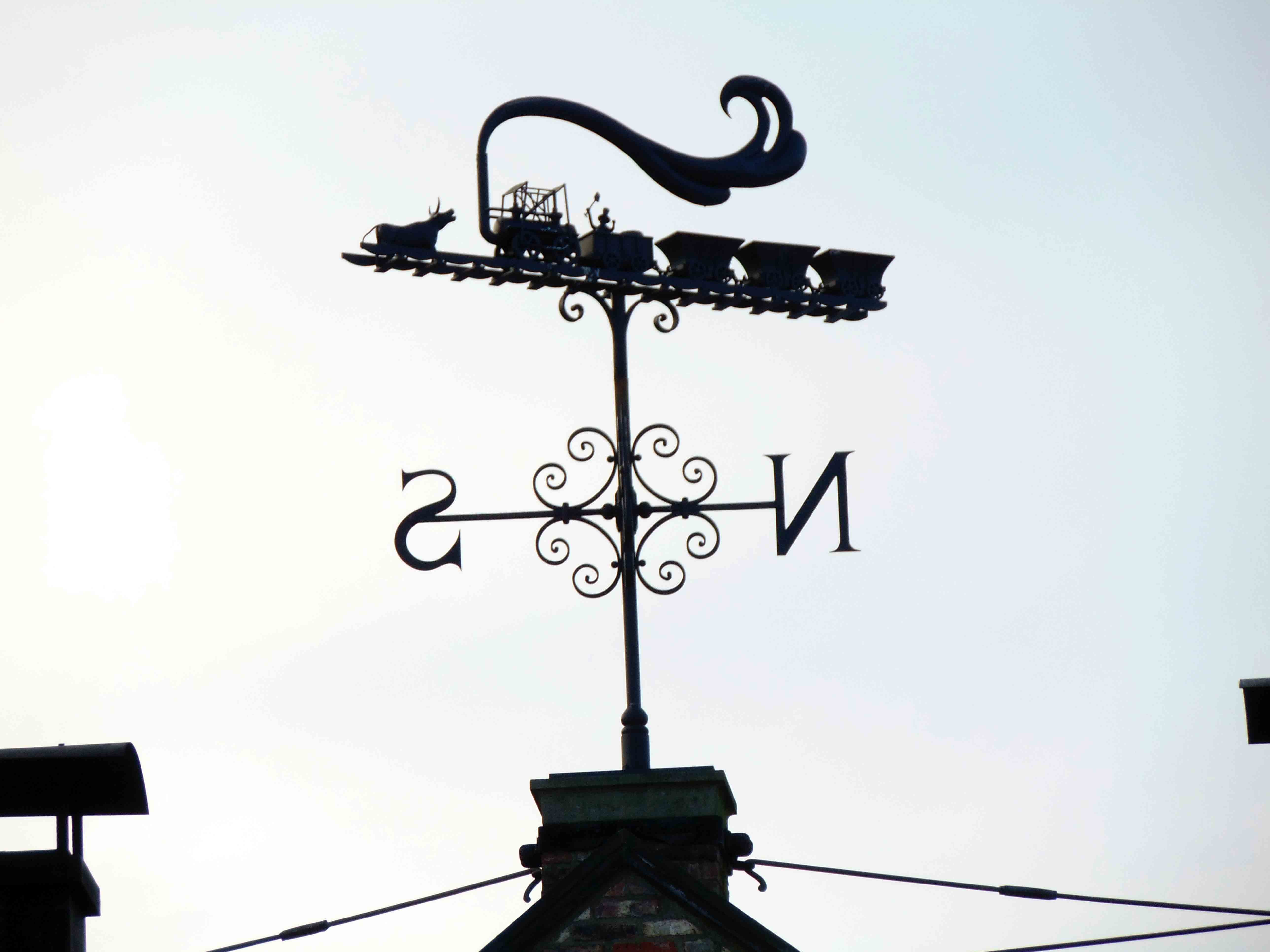 Picture of a fancy weather vane atop a building at Beamish Meuseum