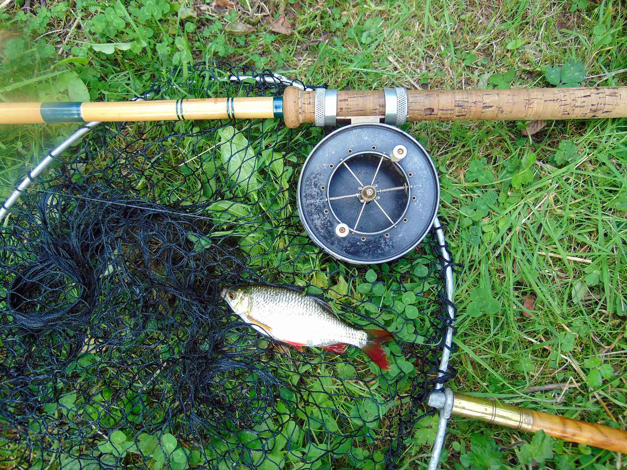 Picture of a small Roach with an Edgar Sealey Floatcaster De-Luxe rod, Allcocks Aerial Popular reel and vintage landing net