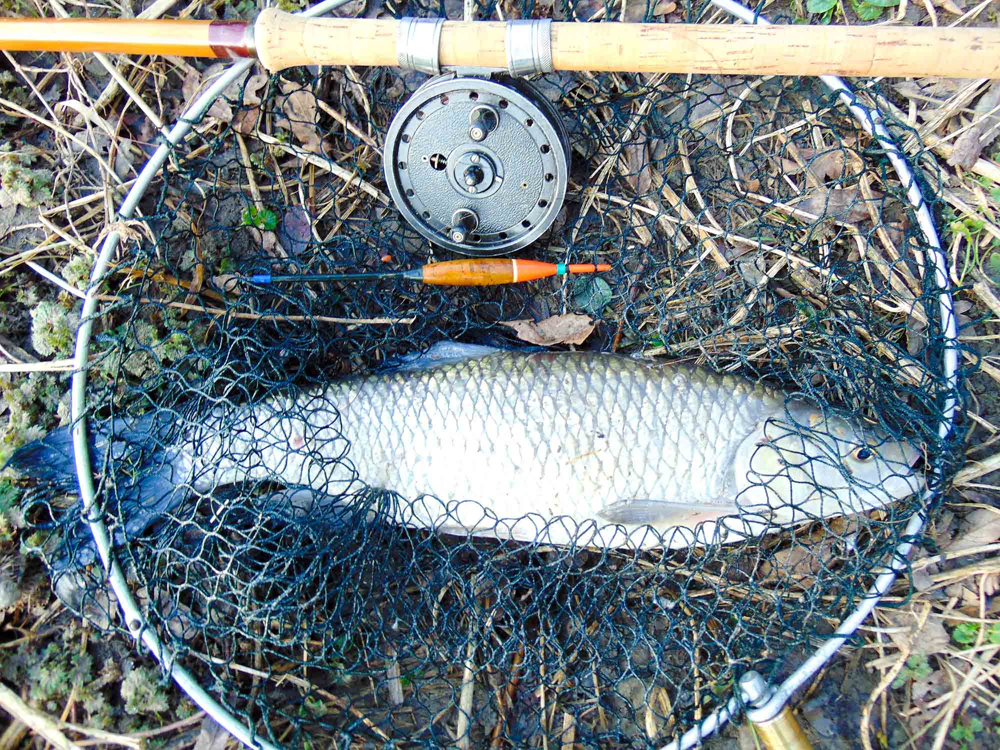 Picture of a Chub in a vintage landing net along with a Rapidex fishing reel mounted on a Fred J. Taylor split cane fishing rod