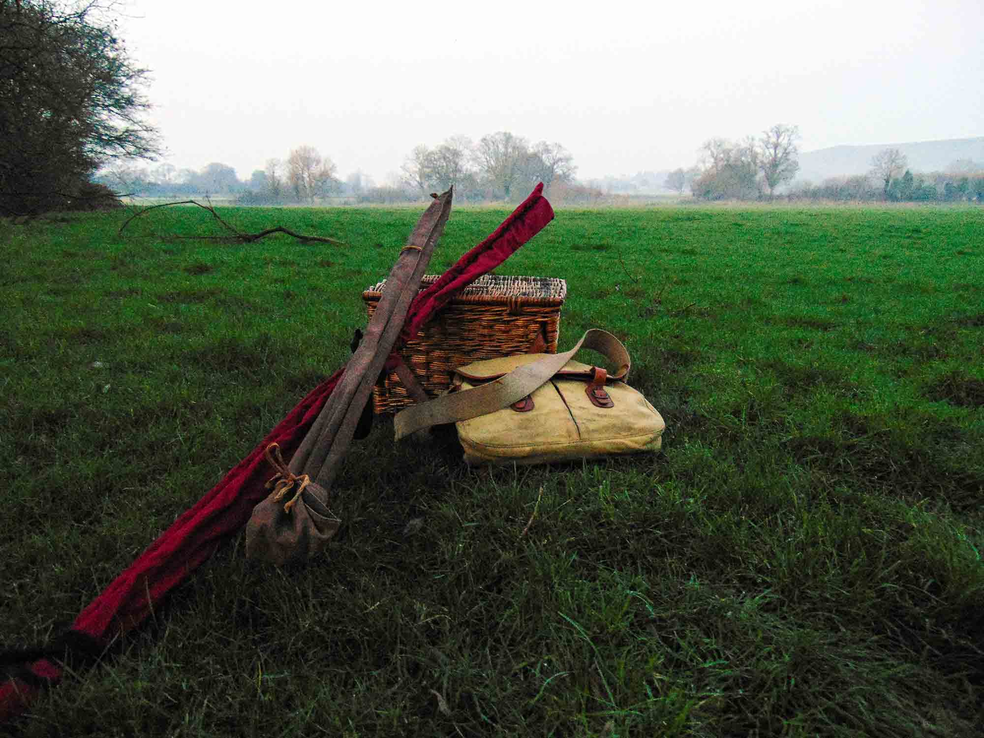 Picture of two fishing rods leaning against a wicker creel with a Brady bay lying along-side on the grass