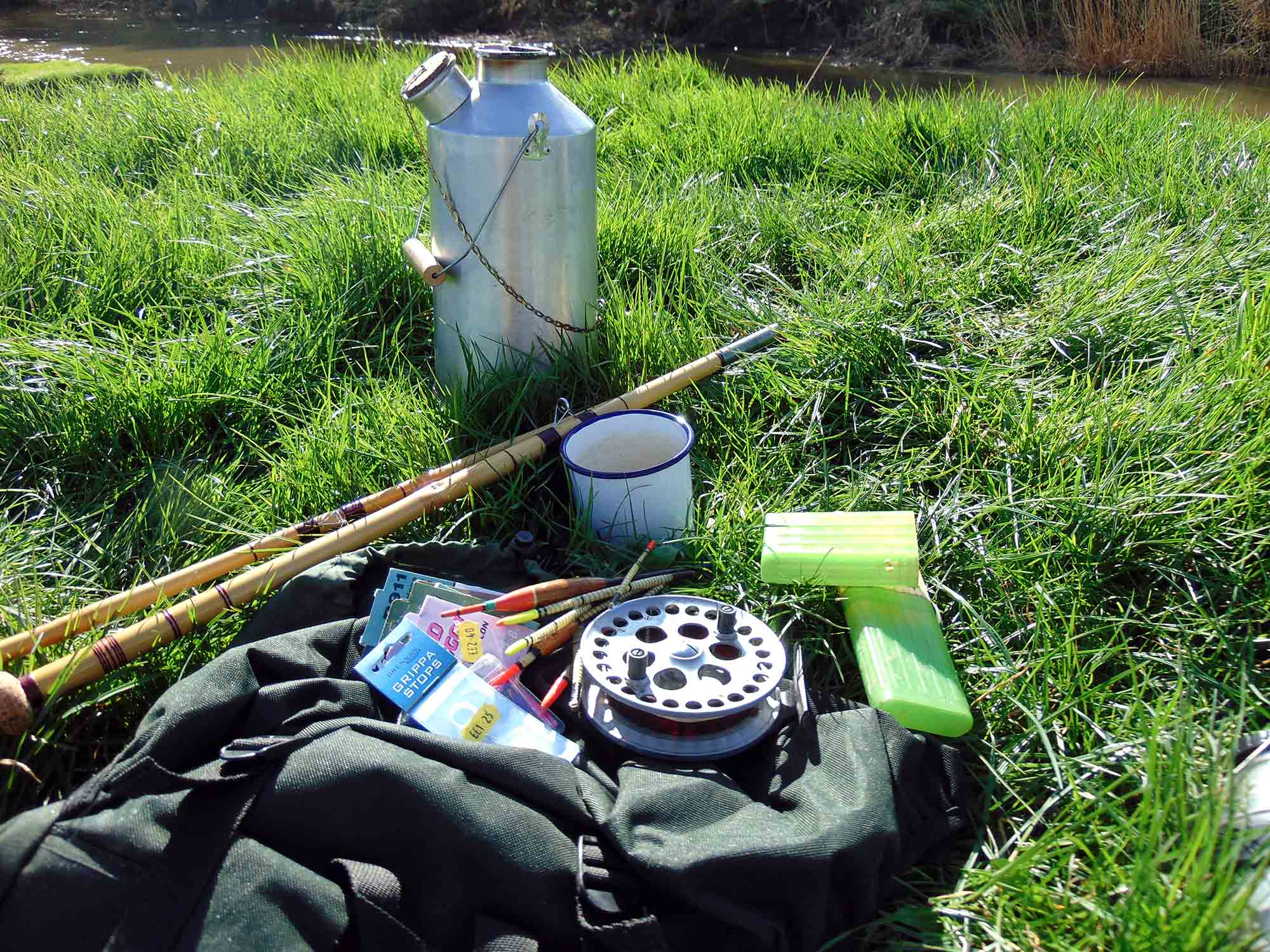 Picture of fishing equipment. Rod, reel, floats and my Kelly Kettle.